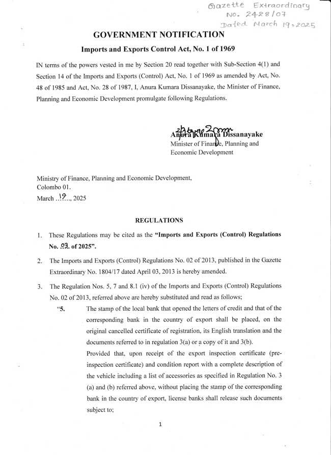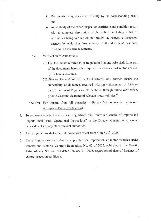 සියලුම රටවලින් ආනයනය කරන ලද වාහන සඳහා බියුරෝ වෙරිටාස් පරීක්ෂණ සහතිකවලට අවසර දීම ඇතුළුව බහුවිධ ආනයන හා අපනයන රෙගුලාසි සංශෝධනය සහිත අතිවිශේෂ ගැසට් පත්‍රය නිකුත් කර තිබේ.